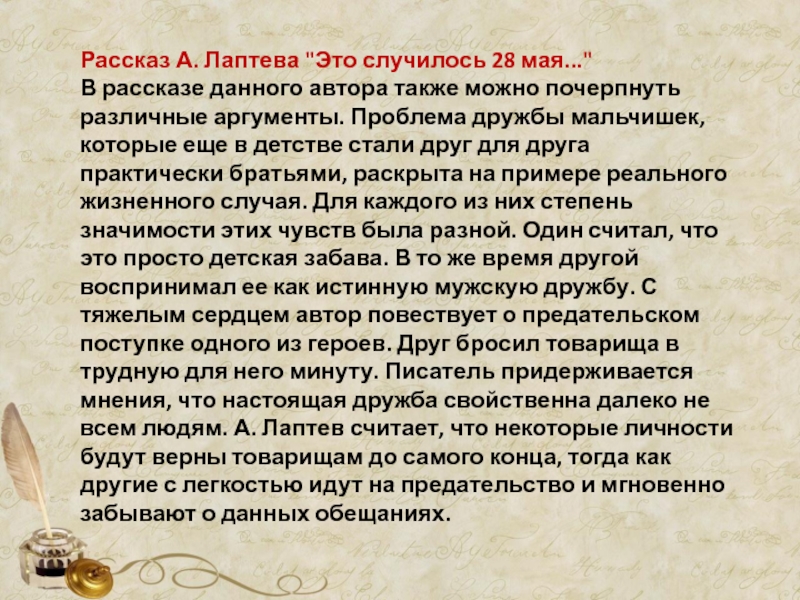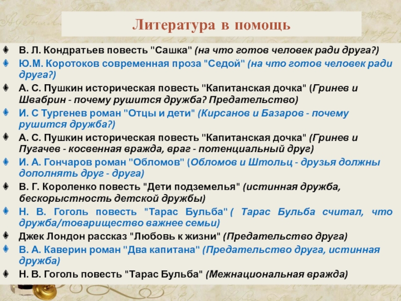 мой читательский опыт. Ведь во многих произведениях мы находим описание и теплоты человеческих отношений, и неприязни людей. Художники слова также рисуют нам примеры, когда дружба перерастает во вражду или наоборот, показывают героев, способных или не способных ценить дружбу, умеющих преодолевать конфликты или сеющих вражду.