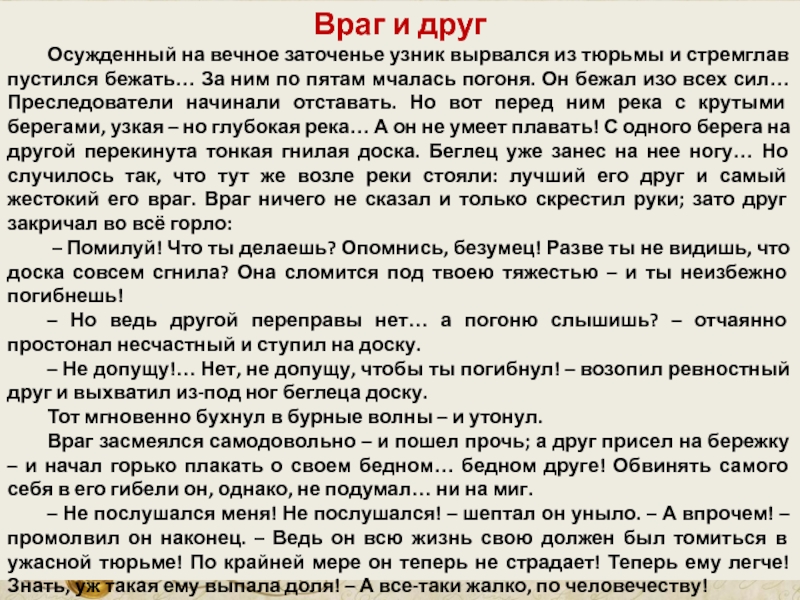 погоня. Он бежал изо всех сил… Преследователи начинали отставать. Но вот перед ним река с крутыми берегами, узкая – но глубокая река… А он не умеет плавать! С одного берега на другой перекинута тонкая гнилая доска. Беглец уже занес на нее ногу… Но случилось так, что тут же возле реки стояли: лучший его друг и самый жестокий его враг. Враг ничего не сказал и только скрестил руки; зато друг закричал во всё горло: