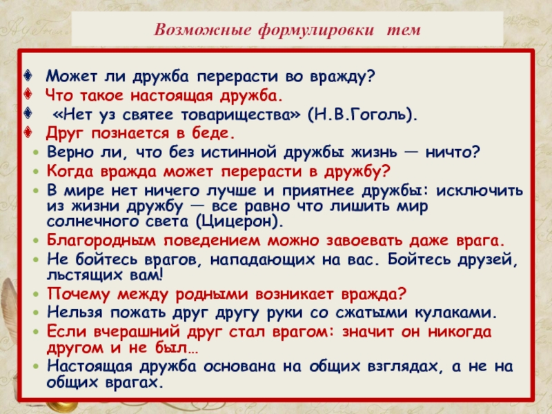 Само понятие «дружба» является одним из основополагающих в человеческом мироощущении и в системе ценностных ориентиров человека. Это подтверждает обилие пословиц и поговорок, посвященных дружбе, афоризмов и крылатых фраз. Начиная размышление над предложенной в данном направлении темой, учащиеся могут строить свои рассуждения, опираясь на известные им высказывания и определения.