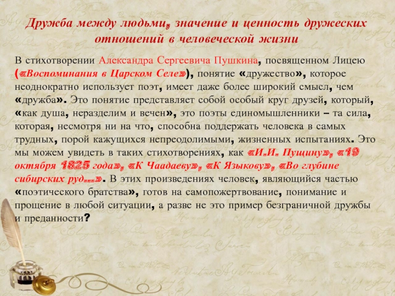 людьми, значение и ценность дружеских отношений в человеческой жизни;