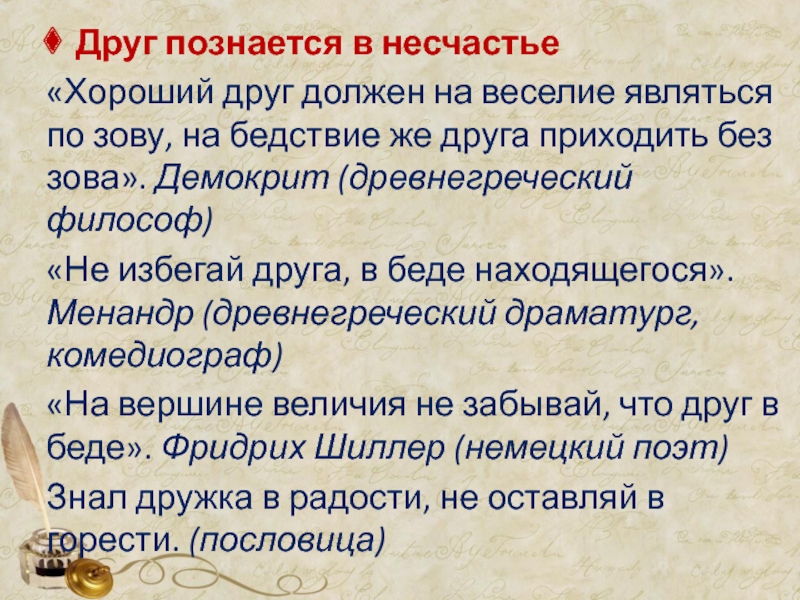 зову, на бедствие же друга приходить без зова». Демокрит (древнегреческий