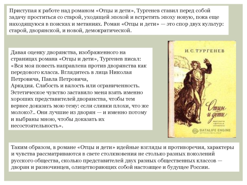 эпоху новую, пока еще находящуюся в поисках и метаниях. Роман «Отцы и дети» — это спор двух культур: старой, дворянской, и новой, демократической.