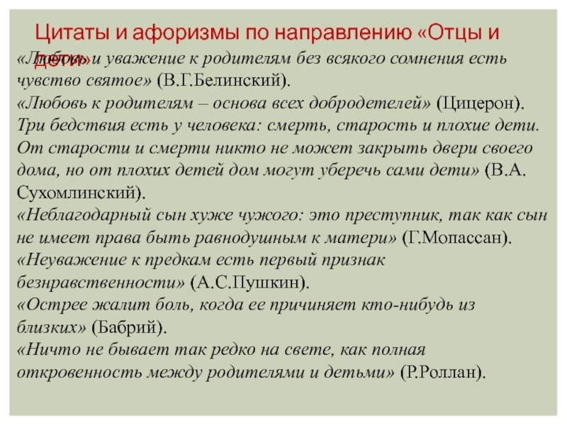 - «Любовь и уважение к родителям без всякого сомнения есть чувство святое» (В.Г.Белинский).