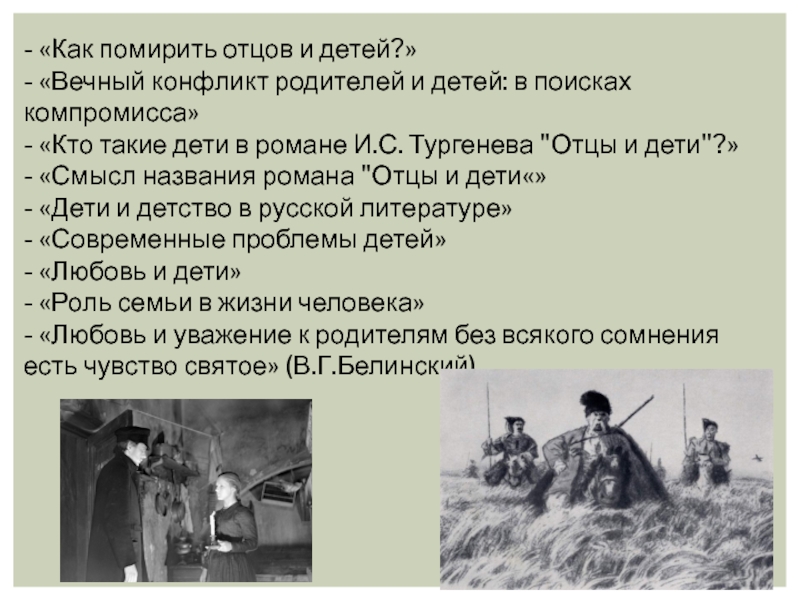 размышлениям над темами данного направления, прежде всего вспомните все произведения, где показаны отношения «отцов» и «детей».