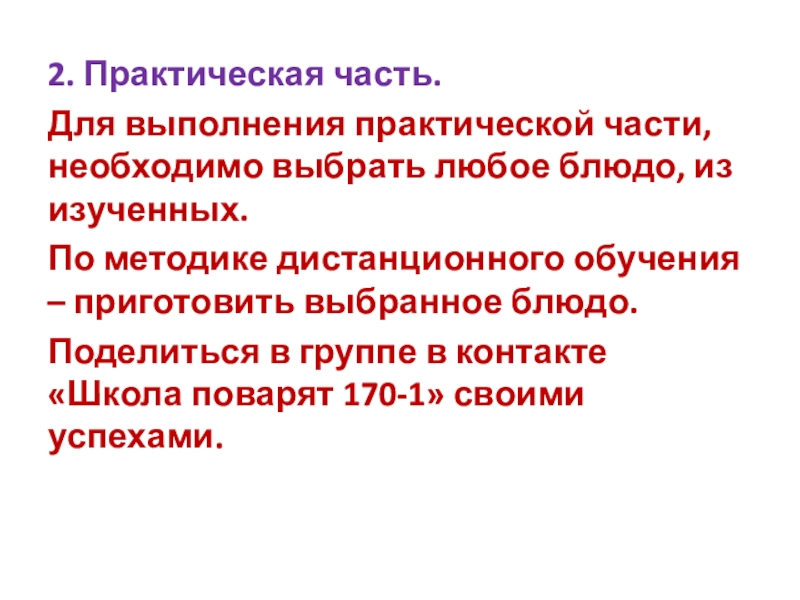 2. Практическая часть.Для выполнения практической части, необходимо выбрать любое блюдо, из изученных.По методике дистанционного обучения – приготовить