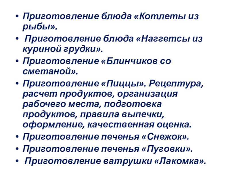 Приготовление блюда «Котлеты из рыбы».  Приготовление блюда «Наггетсы из куриной грудки». Приготовление «Блинчиков со сметаной». Приготовление «Пиццы».