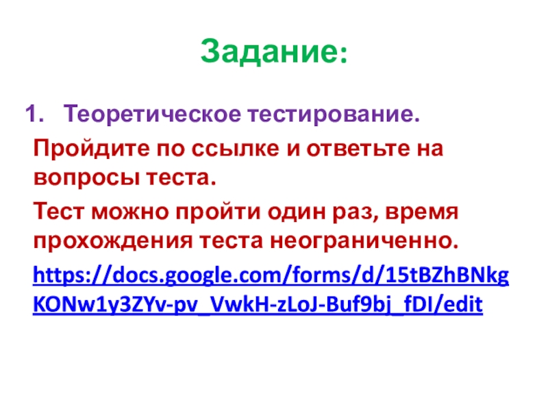 Задание:Теоретическое тестирование.Пройдите по ссылке и ответьте на вопросы теста. Тест можно пройти один раз, время прохождения теста