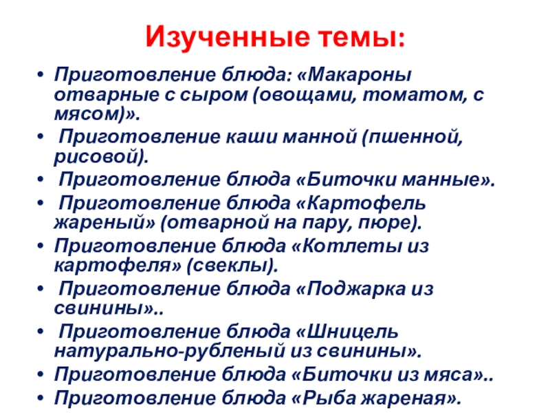 Изученные темы:Приготовление блюда: «Макароны отварные с сыром (овощами, томатом, с мясом)».  Приготовление каши манной (пшенной, рисовой).  Приготовление блюда «Биточки манные».  Приготовление блюда «Картофель жареный» (отварной на пару, пюре). Приготовление блюда «Котлеты