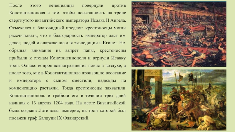 Задар в Далмации, который был главным соперником Венеции на Адриатике. Первоначальный план – использовать Египет в качестве плацдарма для нападения на Палестину – был на время отложен. Узнав о планах венецианцев, папа запретил поход, однако экспедиция состоялась и стоила её участникам отлучения от церкви. В ноябре 1202 года объединённая армия венецианцев и французов основательно разграбила Задар.В Четвертый Крестовый поход, объявленный папой Иннокентием III отправились преимущественно французы и венецианцы. По первоначальной договоренности венецианцы обязались доставить французских крестоносцев по морю к берегам Святой Земли и обеспечить их оружием и провиантом. Из ожидавшихся 30 тысяч французских воинов в Венецию прибыло только 12 тысяч, которые в силу своей малочисленности не могли оплатить зафрактованные корабли и снаряжение.