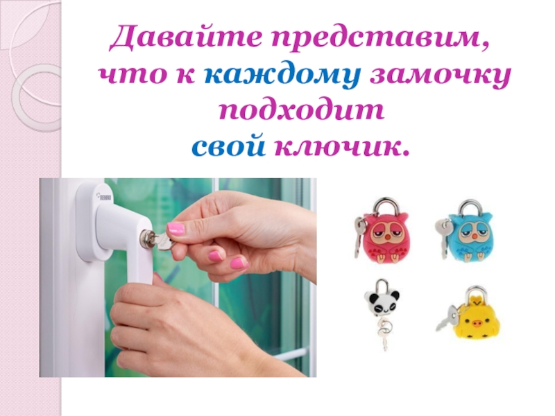 Слайд 3Давайте представим, что к каждому замочку подходит свой ключик.