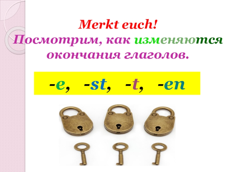 Merkt euch!  Посмотрим, как изменяются  окончания глаголов. -e,  -st,  -t,  -en