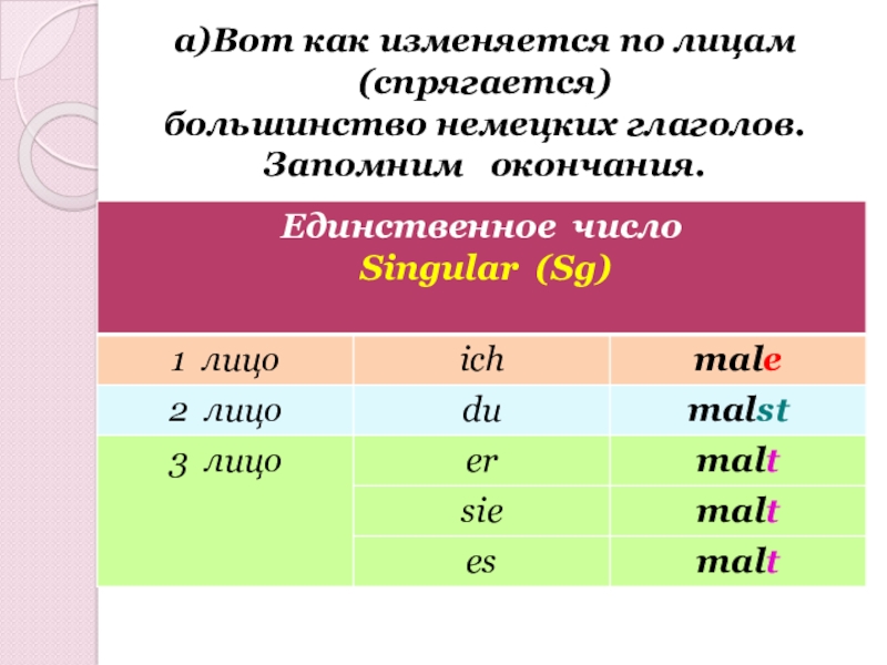 a)Вот как изменяется по лицам (спрягается) большинство немецких глаголов. Запомним  окончания.