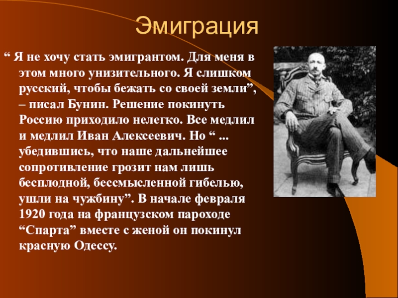 – писал Бунин. Решение покинуть Россию приходило нелегко. Все медлил и медлил Иван Алексеевич. Но “ ...убедившись, что наше дальнейшее сопротивление грозит нам лишь бесплодной, бессмысленной гибелью, ушли на чужбину”. В начале февраля 1920 года на французском пароходе “Спарта” вместе с женой он покинул красную Одессу.