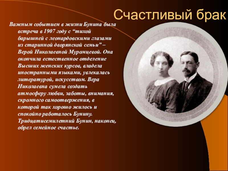 семьи” – Верой Николаевной Муромцевой. Она окончила естественное отделение Высших женских курсов, владела иностранными языками, увлекалась литературой, искусством. Вера Николаевна сумела создать атмосферу любви, заботы, внимания, скромного самоотвержения, в которой так хорошо жилось и спокойно работалось Бунину. Тридцатисемилетний Бунин, наконец, обрел семейное счастье.