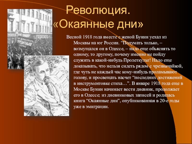 в Одессе, – надо еще объяснять то одному, то другому, почему именно не пойду служить в какой-нибудь Пролеткульт! Надо еще доказывать, что нельзя сидеть рядом с чрезвычайкой, где чуть не каждый час кому-нибудь проламывают голову, и просвещать насчет “последних достижений в инструментовке стиха…”. В январе 1918 года еще в Москве Бунин начинает вести дневник, продолжает его в Одессе; из дневниковых записей и родилась книга “Окаянные дни”, опубликованная в 20-е годы уже в эмиграции.