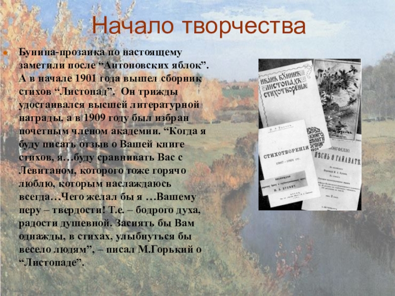 высшей литературной награды, а в 1909 году был избран почетным членом академии. “Когда я буду писать отзыв о Вашей книге стихов, я…буду сравнивать Вас с Левитаном, которого тоже горячо люблю, которым наслаждаюсь всегда…Чего желал бы я …Вашему перу – твердости! Т.е. – бодрого духа, радости душевной. Засиять бы Вам однажды, в стихах, улыбнуться бы весело людям”, – писал М.Горький о “Листопаде”.