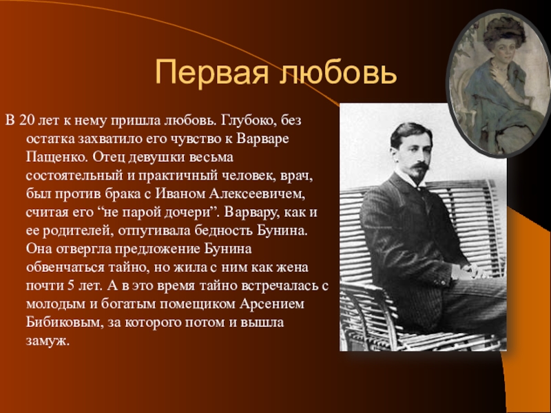 состоятельный и практичный человек, врач, был против брака с Иваном Алексеевичем, считая его “не парой дочери”. Варвару, как и ее родителей, отпугивала бедность Бунина. Она отвергла предложение Бунина обвенчаться тайно, но жила с ним как жена почти 5 лет. А в это время тайно встречалась с молодым и богатым помещиком Арсением Бибиковым, за которого потом и вышла замуж.