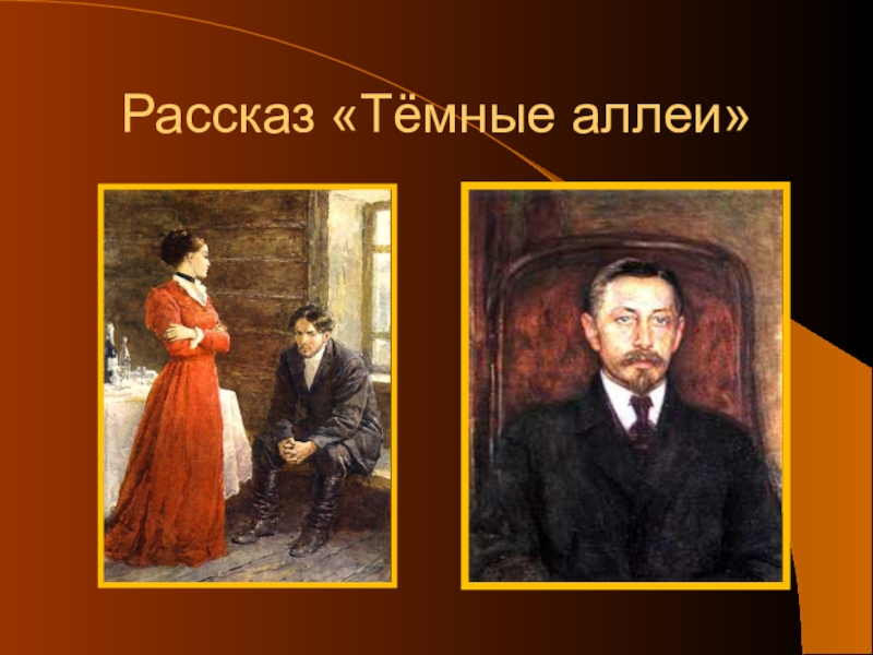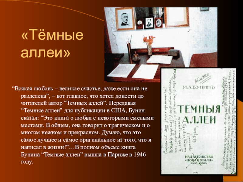 “Темных аллей”. Передавая “Темные аллеи” для публикации в США, Бунин сказал: “Это книга о любви с некоторыми смелыми местами. В общем, она говорит о трагическом и о многом нежном и прекрасном. Думаю, что это самое лучшее и самое оригинальное из того, что я написал в жизни!”…В полном объеме книга Бунина “Темные аллеи” вышла в Париже в 1946 году.