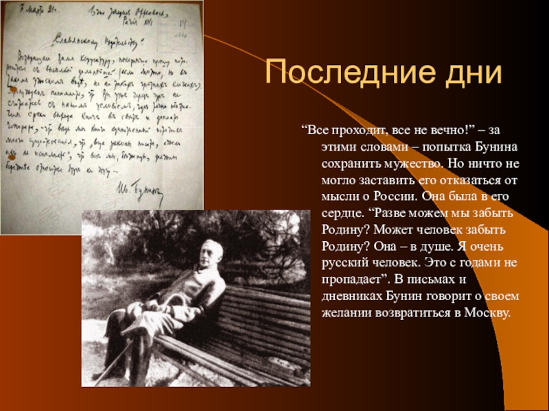 его отказаться от мысли о России. Она была в его сердце. “Разве можем мы забыть Родину? Может человек забыть Родину? Она – в душе. Я очень русский человек. Это с годами не пропадает”. В письмах и дневниках Бунин говорит о своем желании возвратиться в Москву.