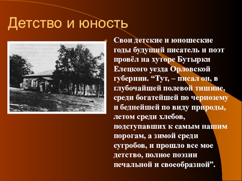 поэт провёл на хуторе Бутырки Елецкого уезда Орловской губернии. “Тут,