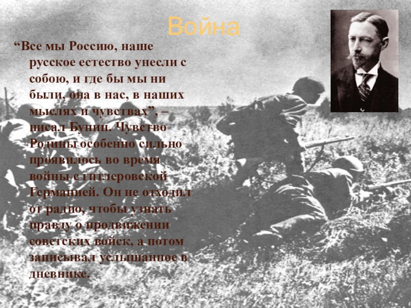 мыслях и чувствах”, – писал Бунин. Чувство Родины особенно сильно проявилось во время войны с гитлеровской Германией. Он не отходил от радио, чтобы узнать правду о продвижении советских войск, а потом записывал услышанное в дневнике.