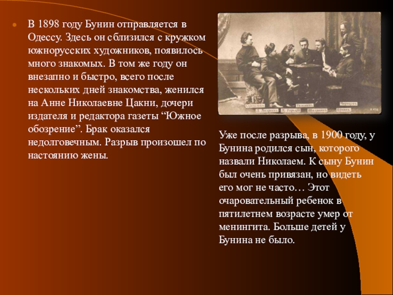 Слайд 6В 1898 году Бунин отправляется в Одессу. Здесь он сблизился