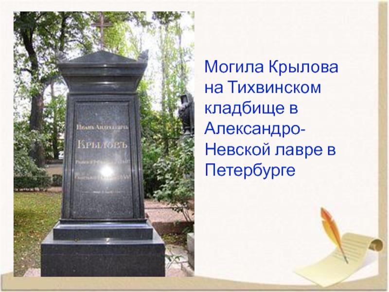 Слайд 21Могила Крылова на Тихвинском кладбище в