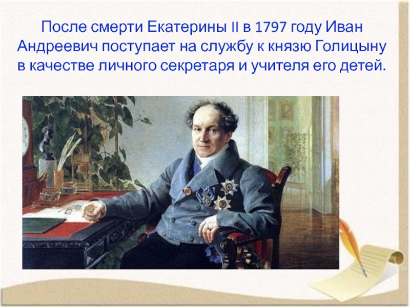 Слайд 11После смерти Екатерины II в 1797 году Иван Андреевич поступает
