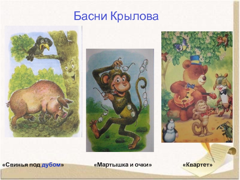 «Свинья под дубом»«Мартышка и очки»«Квартет»Басни Крылова