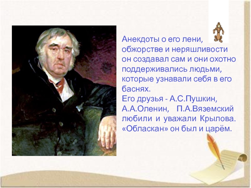 А.А.Оленин, П.А.Вяземский любили и уважали Крылова. «Обласкан» он был и царём.