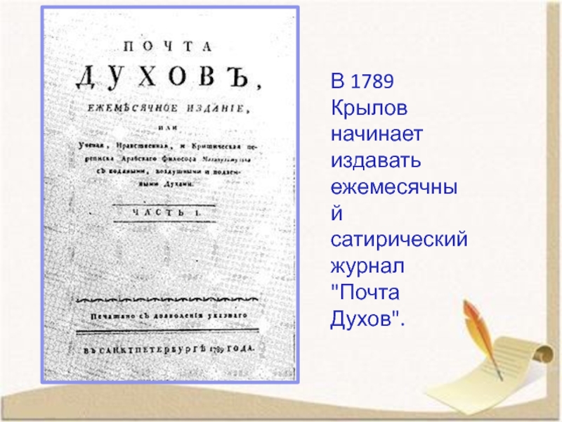 Слайд 9В 1789 Крылов начинает издавать ежемесячный сатирический журнал "Почта Духов".