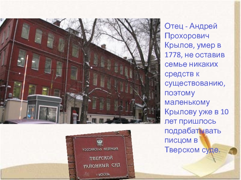 Слайд 4Отец - Андрей Прохорович Крылов, умер в 1778, не оставив