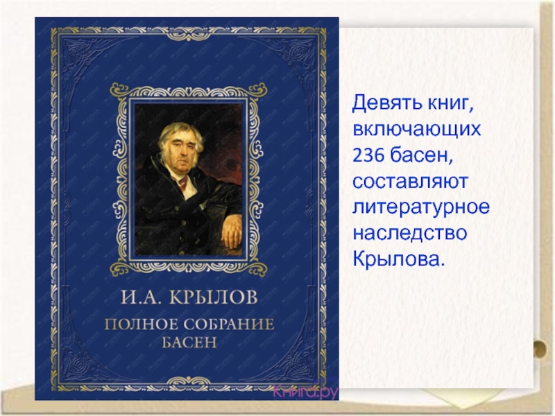 Слайд 17Девять книг, включающих 236 басен, составляют литературное наследство Крылова.
