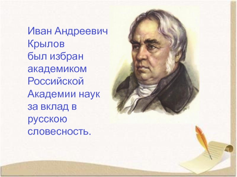 Иван Андреевич Крыловбыл избран академикомРоссийской Академии наукза вклад в русскою словесность.