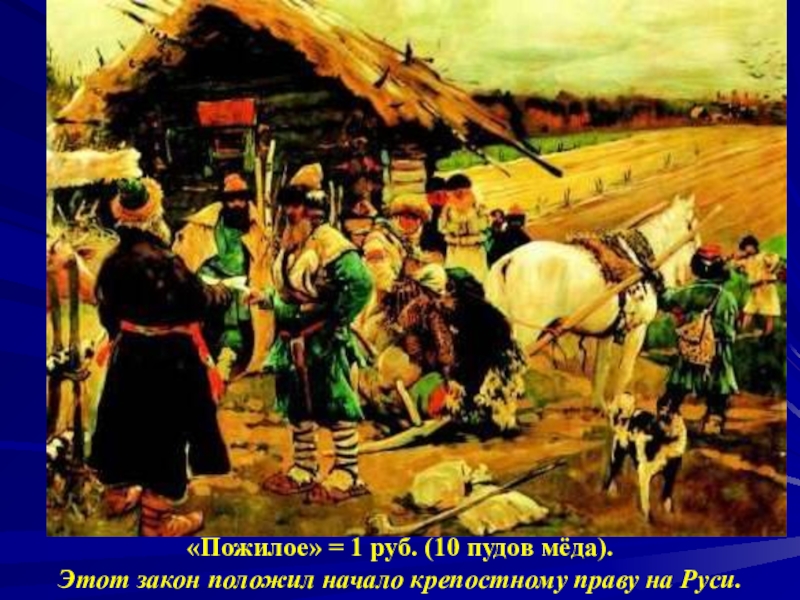 законов. Самым важным нововведением было установ-ление точного срока перехода зависи-мых крестьян от одного землевладель-ца к другому — неделя до и неделя после Юрьева дня осеннего (26 ноября). Уходя от господина, крестьянин был обязан также уплатить «пожилое» - плату за проживание на его земле.
