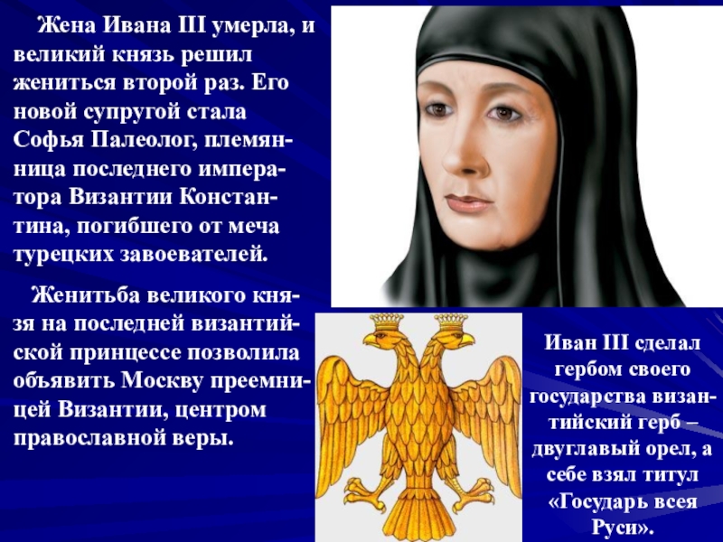 Женитьба великого кня-зя на последней византий-ской принцессе позволила объявить Москву преемни-цей Византии, центром православной веры.