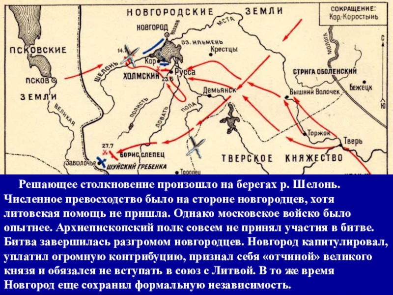 было опытнее. Архиепископский полк совсем не принял участия в битве. Битва завершилась разгромом новгородцев. Новгород капитулировал, уплатил огромную контрибуцию, признал себя «отчиной» великого князя и обязался не вступать в союз с Литвой. В то же время Новгород еще сохранил формальную независимость.