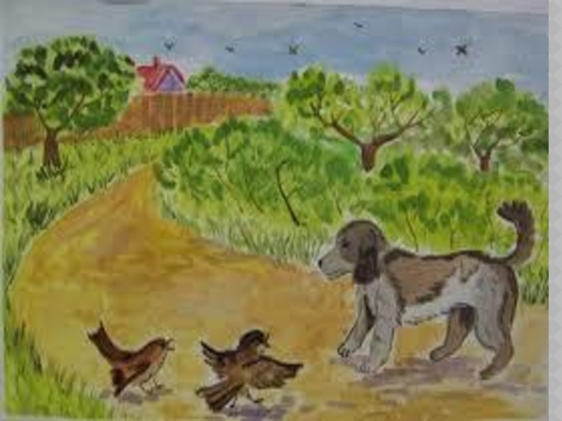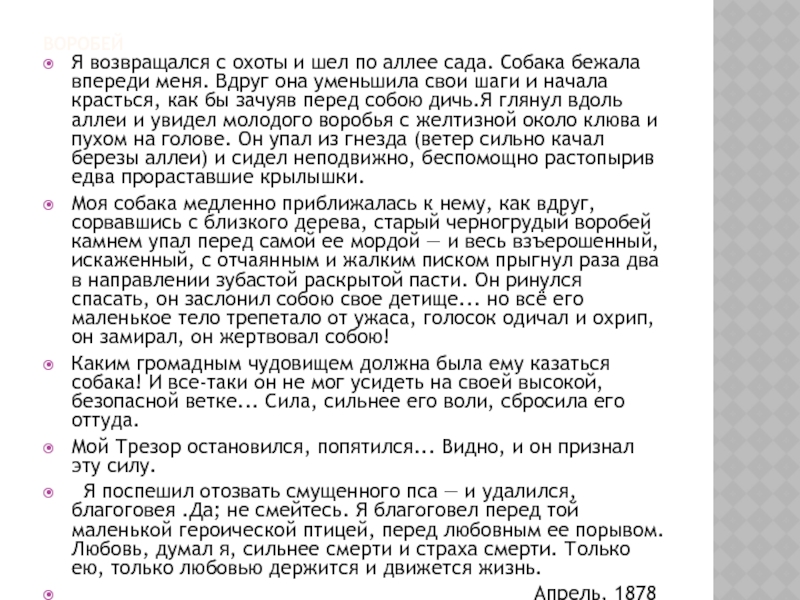 Моя собака медленно приближалась к нему, как вдруг, сорвавшись с близкого дерева, старый черногрудый воробей камнем упал перед самой ее мордой — и весь взъерошенный, искаженный, с отчаянным и жалким писком прыгнул раза два в направлении зубастой раскрытой пасти. Он ринулся спасать, он заслонил собою свое детище... но всё его маленькое тело трепетало от ужаса, голосок одичал и охрип, он замирал, он жертвовал собою!