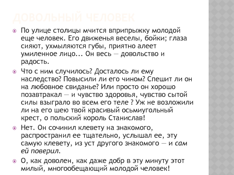 Что с ним случилось? Досталось ли ему наследство? Повысили ли его чином? Спешит ли он на любовное свиданье? Или просто он хорошо позавтракал — и чувство здоровья, чувство сытой силы взыграло во всем его теле ? Уж не возложили ли на его шею твой красивый осьмиугольный крест, о польский король Станислав!