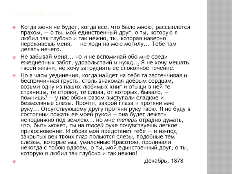 о ты, которую я любил так глубоко и так нежно, ты, которая наверно переживешь меня, — не ходи на мою могилу... Тебе там делать нечего.