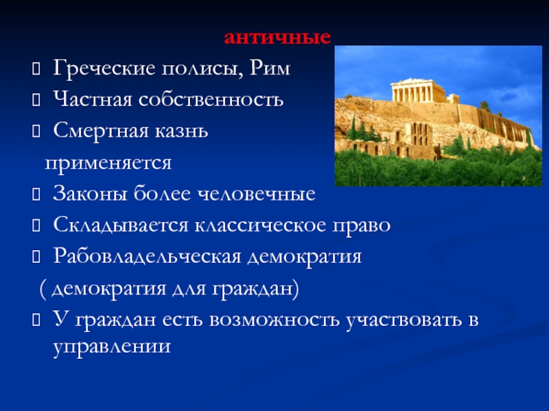 античныеГреческие полисы, РимЧастная собственностьСмертная казнь  применяетсяЗаконы более человечныеСкладывается классическое правоРабовладельческая демократия ( демократия для граждан)У