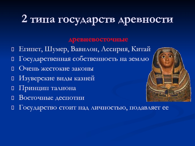 2 типа государств древности древневосточныеЕгипет, Шумер, Вавилон, Ассирия, КитайГосударственная собственность на землюОчень жестокие законыИзуверские виды казнейПринцип талионаВосточные