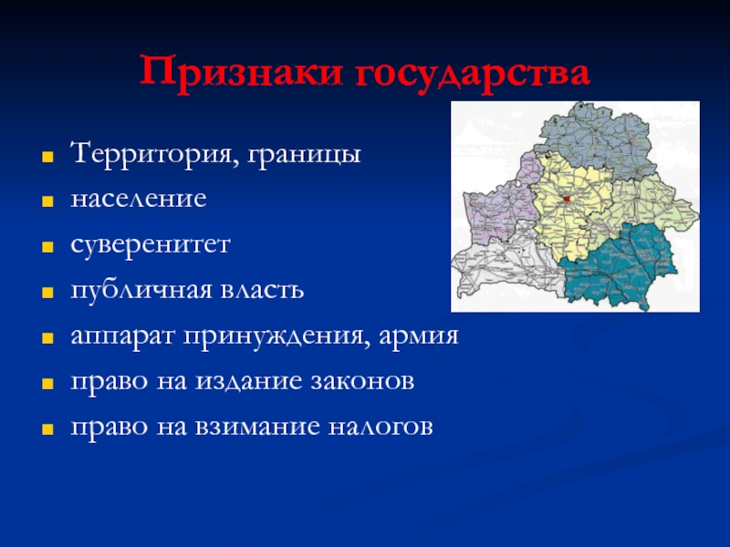 Признаки государстваТерритория, границынаселениесуверенитетпубличная властьаппарат принуждения, армияправо на издание законовправо на взимание налогов