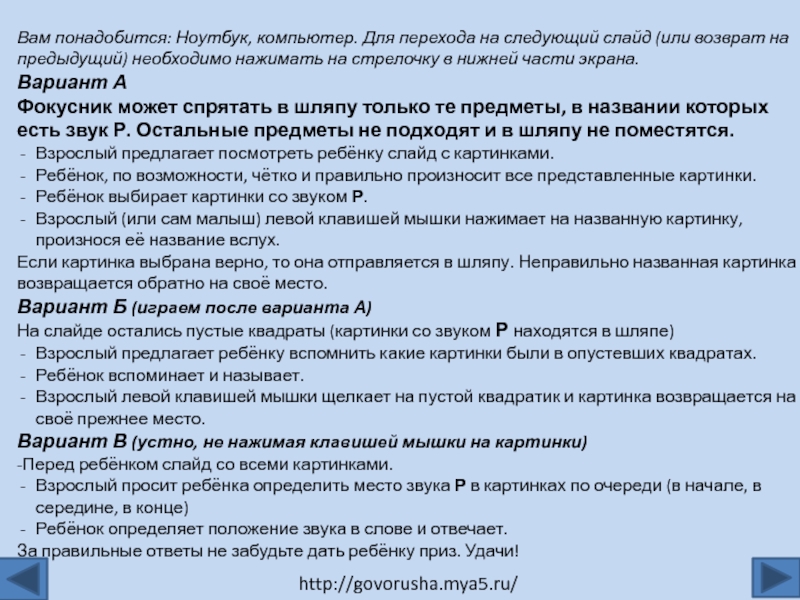 Фокусник может спрятать в шляпу только те предметы, в названии которых есть звук Р. Остальные предметы не подходят и в шляпу не поместятся.