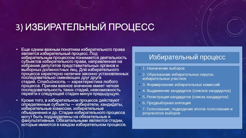 процесс. Под избирательным процессом понимается деятельность субъектов избирательного права, направленная
