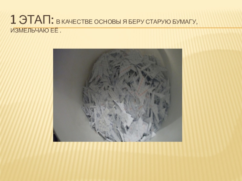 Слайд 131 ЭТАП: в качестве основы я беру старую бумагу, измельчаю