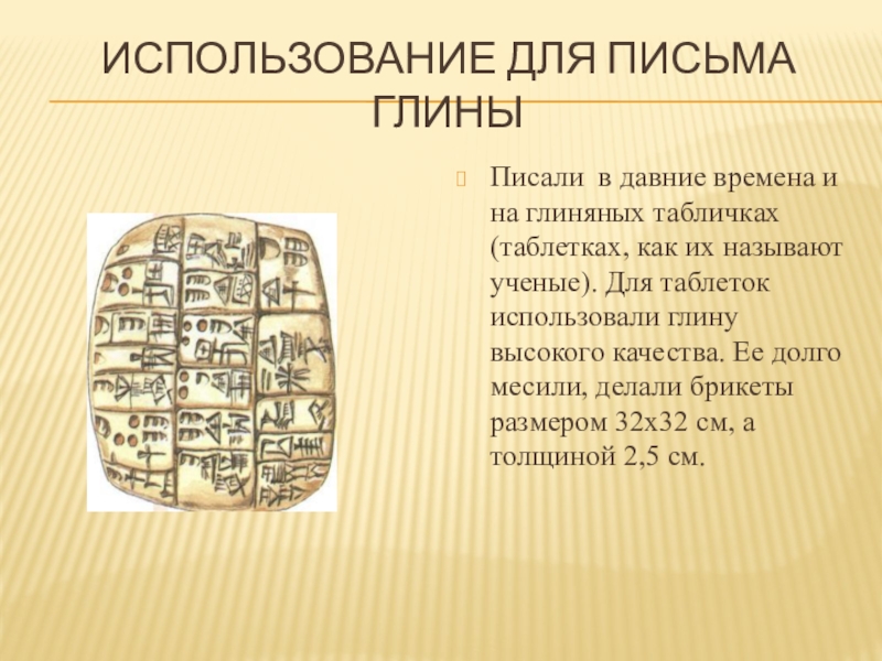 Слайд 4ИСПОЛЬЗОВАНИЕ ДЛЯ ПИСЬМА ГЛИНЫ