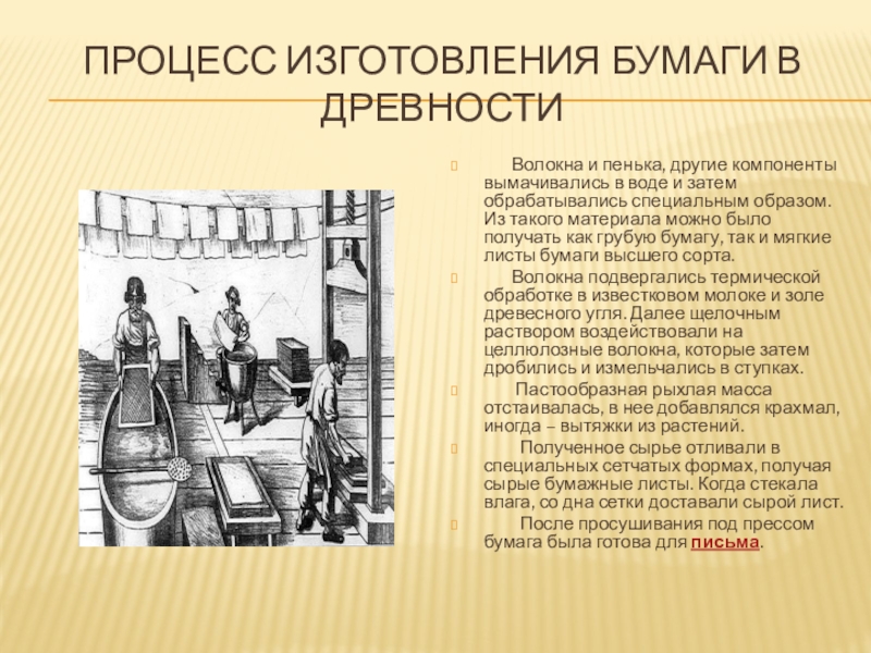 Слайд 10ПРОЦЕСС ИЗГОТОВЛЕНИЯ БУМАГИ В ДРЕВНОСТИ