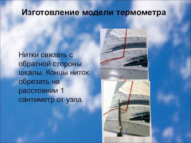 Изготовление модели термометраНитки связать с обратной стороны шкалы. Концы ниток обрезать на расстоянии 1 сантиметр от узла.
