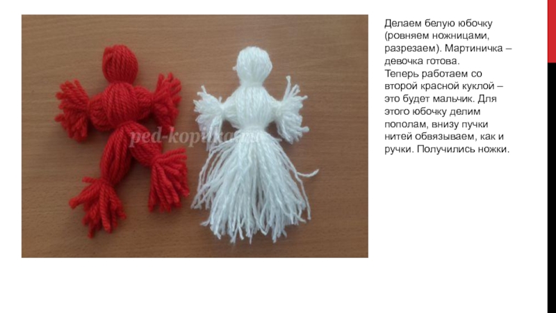 Делаем белую юбочку (ровняем ножницами, разрезаем). Мартиничка – девочка готова.  Теперь работаем со второй красной куклой